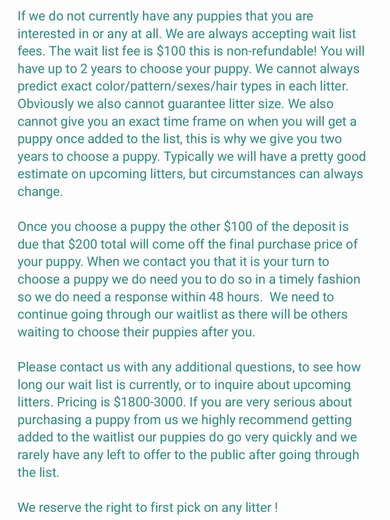***When scheduling a visit or pick up time please be respectful of our time. We have lives outside of our dogs/puppies. We have children and nieces and nephews involded in school and activities. We also often have multiple puppies leaving in a day and try to schedule pick ups so they do not overlap this gives us time to make sure we can thoroughly go over instructions for taking your new puppy home and answer any and all questions. If you will be arriving more then 15 min. early or late we ask you to please let us know. If you will be more than 15 min. late we may unfortunately need to reschedule.