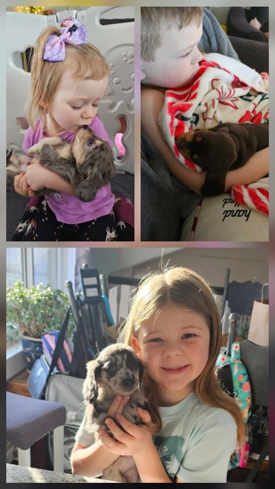 We have over 18 years of experience breeding and raising dachshunds! We strive to raise happy, healthy, well rounded puppies that are true to the breed standard and will make excellent family pets. All our puppies are sold as pets ONLY without registration papers! Our puppies are raised in our home around kids, people, dogs and the normal day to day comings and goings of an active household. They go to their new homes current on vaccinations and deworming and have been examined by a licensed veterinarian we provide documentation on all of this. We also provide a written health and genetic guarantee. All puppies are sent home with a goodie basket including a bag of food, toys, chewies, and a blanket that smells like mom and littermates to help with the transition to a new family. All our adults have been health checked and DNA tested for any predisposition to genetic disorders for their exact colors and patterns and to ensure they are in fact 100% pure bred dachshunds. Any puppy can be put on hold before they are ready to go at 8 weeks. We require a $200 NONREFUNDABLE deposit.